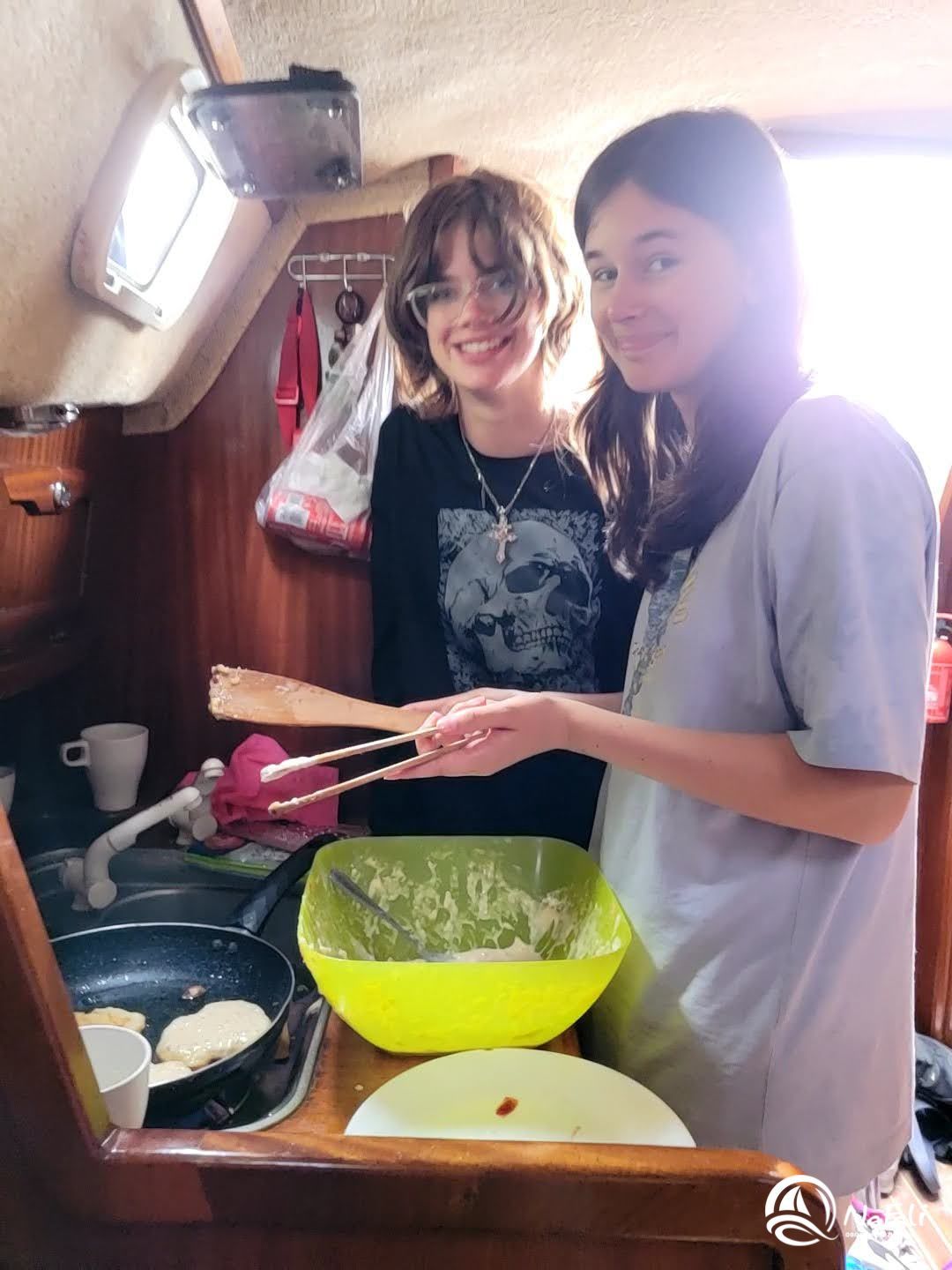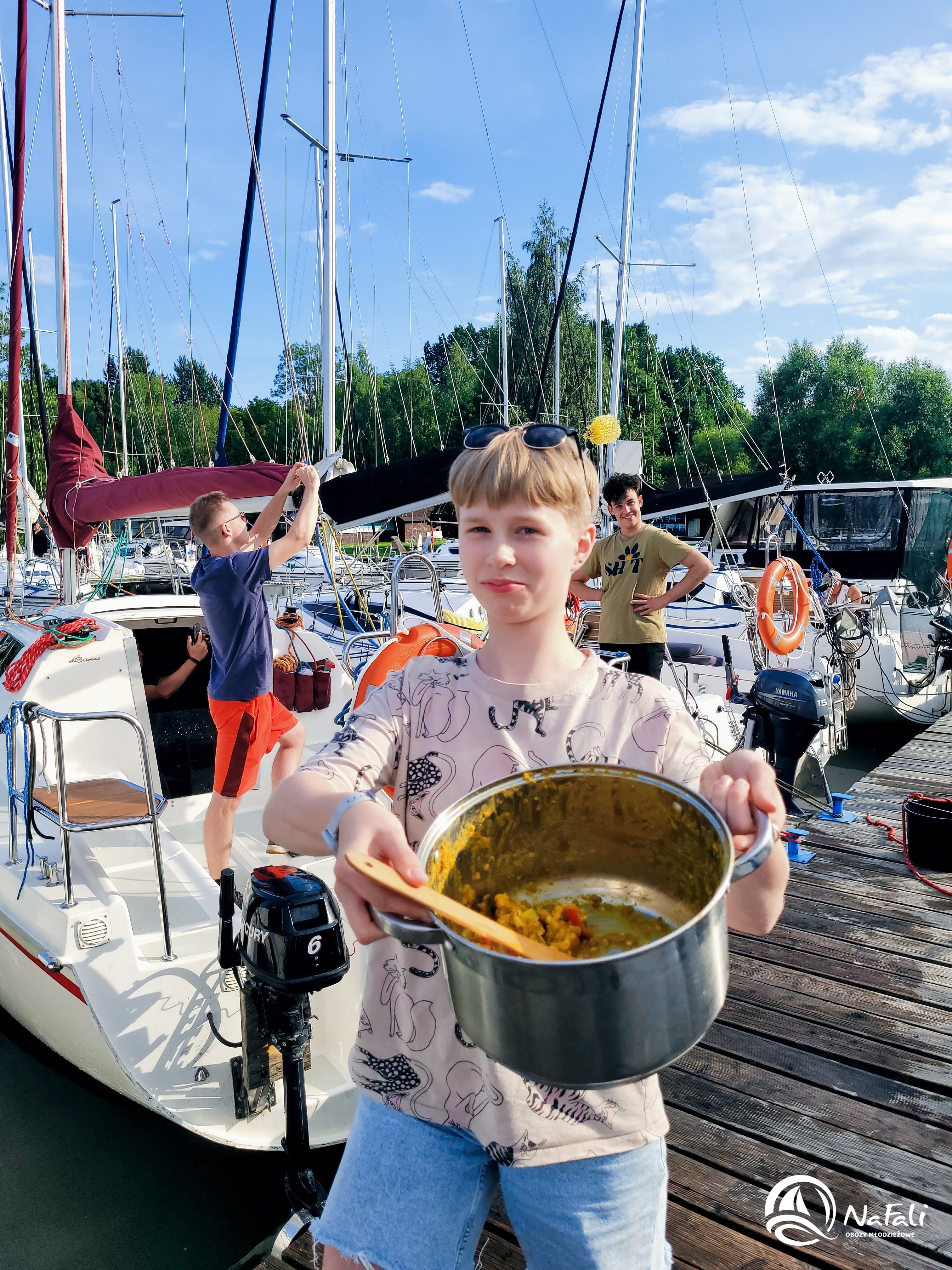 Obowiązki związane z gotowaniem dzielone są między uczestników obozu. Każdego dnia wyznaczana jest grupa 2-3 osób odpowiedzialnych za przygotowanie posiłków dla całej załogi. Dzieci i młodzież pod okiem wychowawców uczą się planować posiłki, robić zakupy i gotować w trudnych warunkach panujących na pokładzie jachtu.