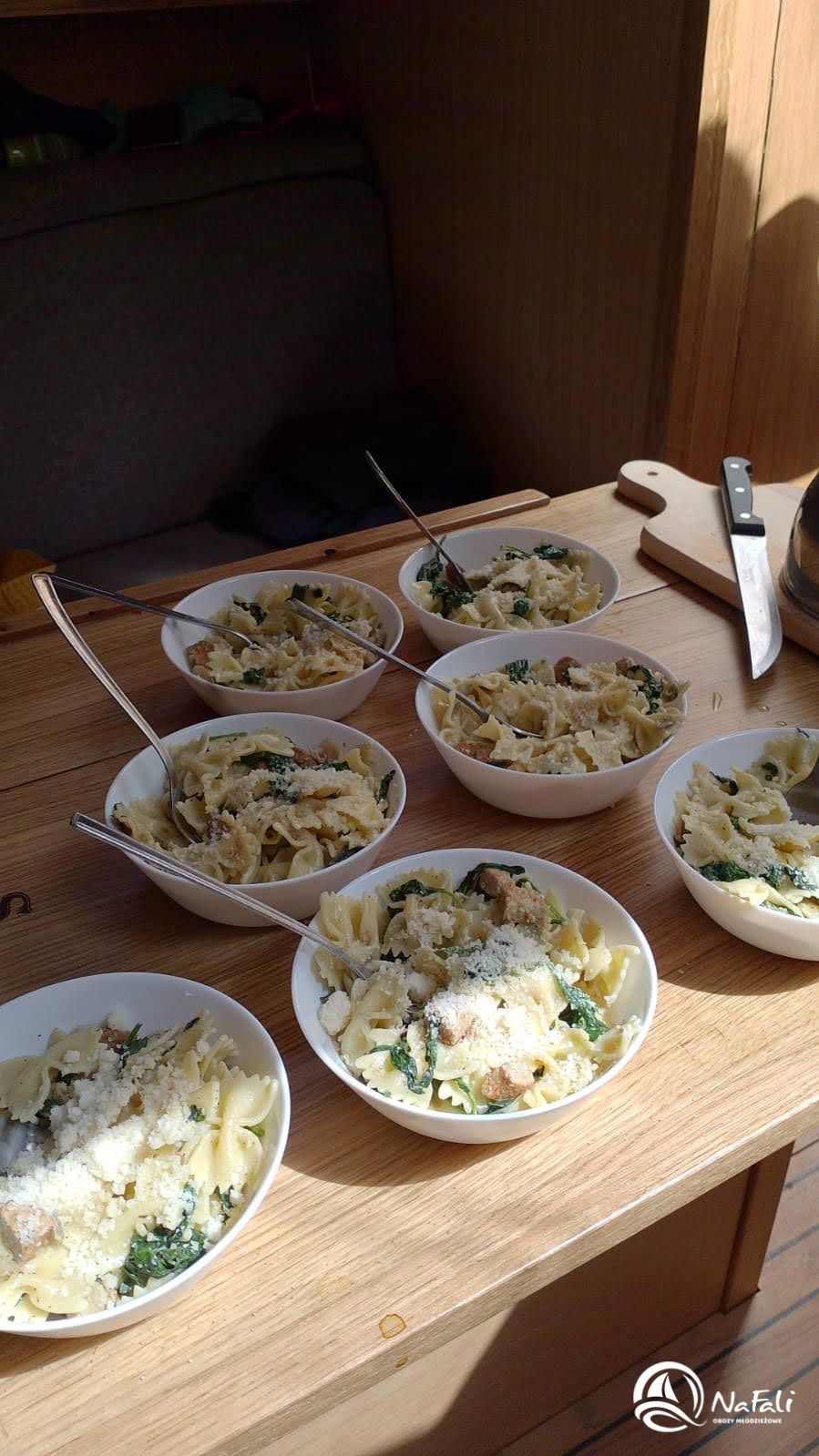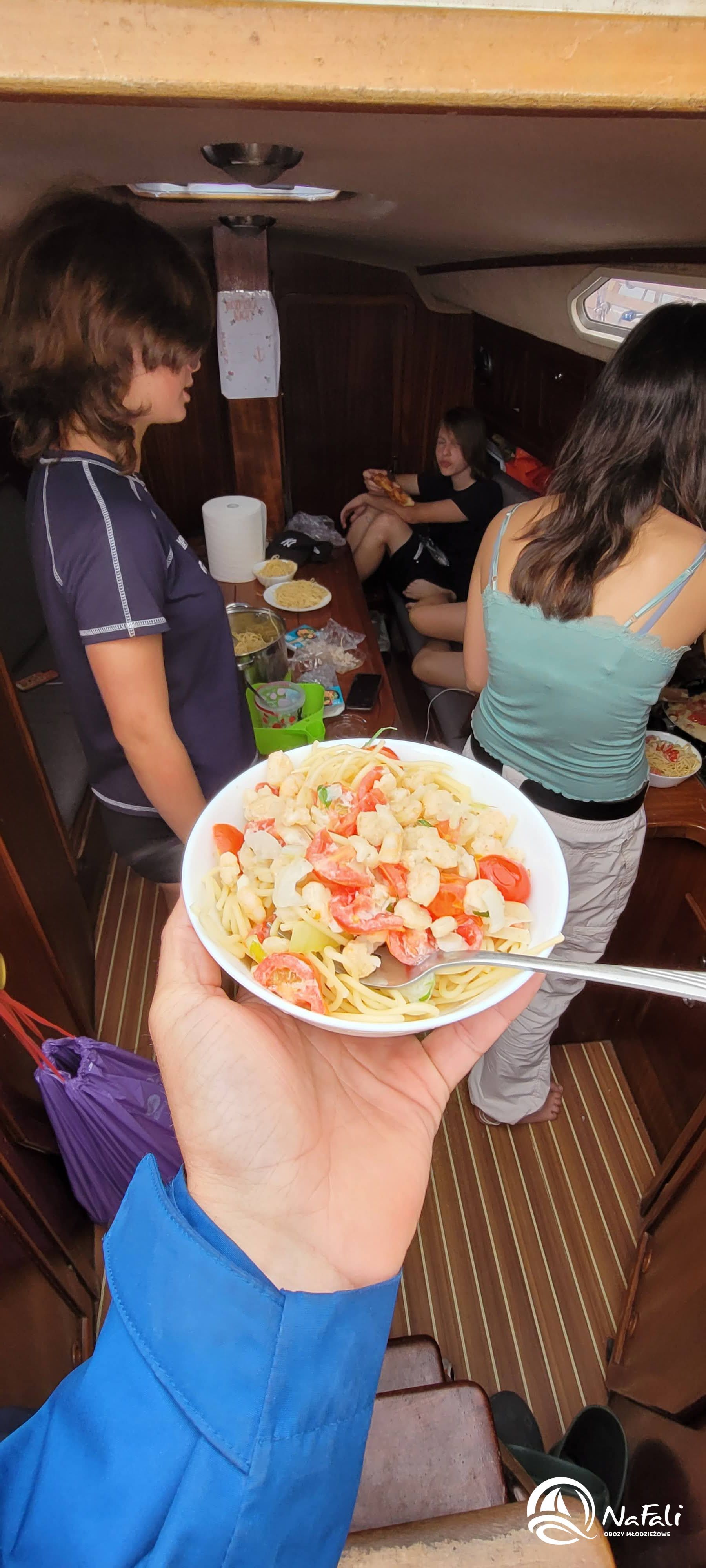 Posiłki są jednym z najważniejszych elementów obozu. W trakcie rejsu młodzież spożywa posiłki w salonie jachtu lub na pokładzie, jeśli pogoda na to pozwala.